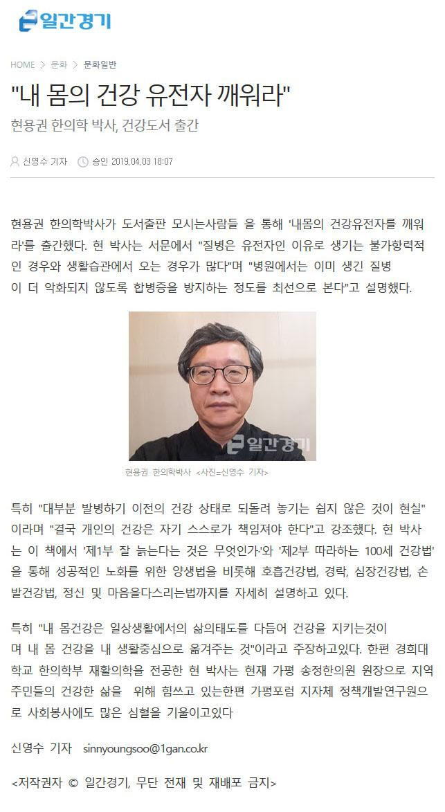"내 몸의 건강 유전자 깨워라"현용권 한의학 박사, 건강도서 출간현용권 한의학박사가 도서출판 모시는사람들 을 통해 '내몸의 건강유전자를 깨워라'를 출간했다. 현 박사는 서문에서 "질병은 유전자인 이유로 생기는 불가항력적인 경우와 생활습관에서 오는 경우가 많다"며 "병원에서는 이미 생긴 질병이 더 악화되지 않도록 합병증을 방지하는 정도를 최선으로 본다"고 설명했다. 특히 "대부분 발병하기 이전의 건강 상태로 되돌려 놓기는 쉽지 않은 것이 현실"이라며 "결국 개인의 건강은 자기 스스로가 책임져야 한다"고 강조했다. 현 박사는 이 책에서 '제1부 잘 늙는다는 것은 무엇인가·'와 '제2부 따라하는 100세 건강법'을 통해 성공적인 노화를 위한 양생법을 비롯해 호흡건강법, 경락, 심장건강법, 손발건강법, 정신 및 마음을다스리는법까지를 자세히 설명하고 있다. 특히 "내 몸건강은 일상생활에서의 삶의태도를 다듬어 건강을 지키는것이며 내 몸 건강을 내 생활중심으로 옮겨주는 것"이라고 주장하고있다. 한편 경희대학교 한의학부 재활의학을 전공한 현 박사는 현재 가평 송정한의원 원장으로 지역주민들의 건강한 삶을 위해 힘쓰고 있는한편 가평포럼 지자체 정책개발연구원으로 사회봉사에도 많은 심혈을 기울이고있다. 신영수 기자 sinnyoungsoo@1gan.co.kr <출처: 일간경기(http://www.1gan.co.kr/news/articleView.html?idxno=176680)> |