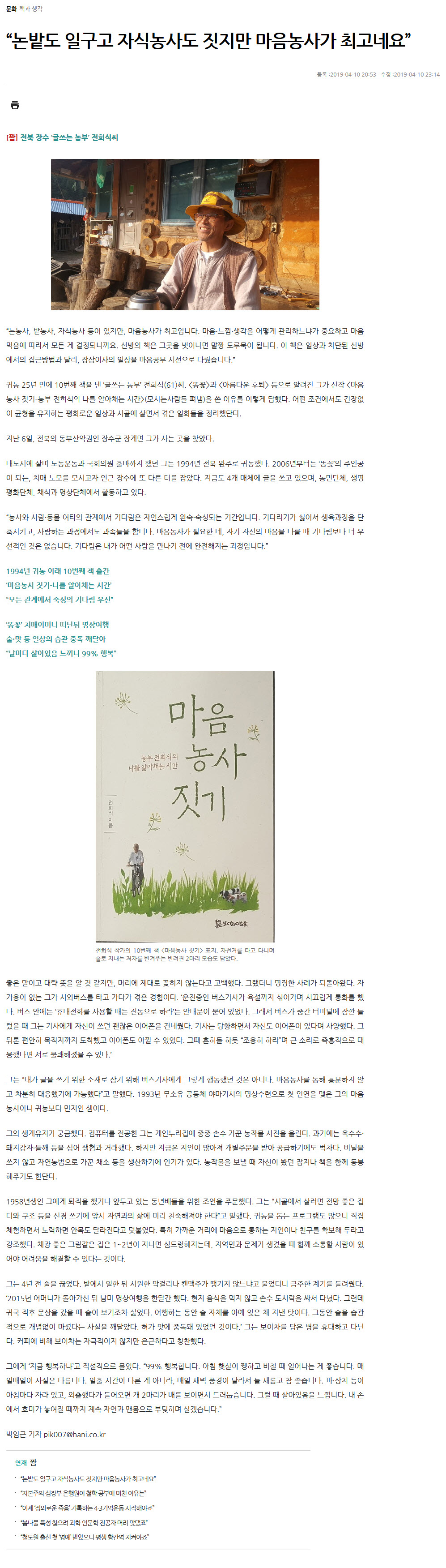 “논밭도 일구고 자식농사도 짓지만 마음농사가 최고네요”[짬] 전북 장수 ‘글쓰는 농부’ 전희식씨“논농사, 밭농사, 자식농사 등이 있지만, 마음농사가 최고입니다. 마음·느낌·생각을 어떻게 관리하느냐가 중요하고 마음먹음에 따라서 모든 게 결정되니까요. 선방의 책은 그곳을 벗어나면 말짱 도루묵이 됩니다. 이 책은 일상과 차단된 선방에서의 접근방법과 달리, 장삼이사의 일상을 마음공부 시선으로 다뤘습니다.” 귀농 25년 만에 10번째 책을 낸 ‘글쓰는 농부’ 전희식(61)씨. <똥꽃>과 <아름다운 후퇴> 등으로 알려진 그가 신작 <마음농사 짓기-농부 전희식의 나를 알아채는 시간>(모시는사람들 펴냄)을 쓴 이유를 이렇게 답했다. 어떤 조건에서도 긴장없이 균형을 유지하는 평화로운 일상과 시골에 살면서 겪은 일화들을 정리했단다. 지난 6일, 전북의 동부산악권인 장수군 장계면 그가 사는 곳을 찾았다. 대도시에 살며 노동운동과 국회의원 출마까지 했던 그는 1994년 전북 완주로 귀농했다. 2006년부터는 ‘똥꽃’의 주인공이 되는, 치매 노모를 모시고자 인근 장수에 또 다른 터를 잡았다. 지금도 4개 매체에 글을 쓰고 있으며, 농민단체, 생명평화단체, 채식과 명상단체에서 활동하고 있다. “농사와 사람·동물 여타의 관계에서 기다림은 자연스럽게 완숙·숙성되는 기간입니다. 기다리기가 싫어서 생육과정을 단축시키고, 사랑하는 과정에서도 과속들을 합니다. 마음농사가 필요한 데, 자기 자신의 마음을 다룰 때 기다림보다 더 우선적인 것은 없습니다. 기다림은 내가 어떤 사람을 만나기 전에 완전해지는 과정입니다.” 1994년 귀농 이래 10번째 책 출간 전희식 작가의 10번째 책 <마음농사 짓기> 표지. 자전거를 타고 다니며 홀로 지내는 저자를 반겨주는 반려견 2마리 모습도 담았다. 그는 “내가 글을 쓰기 위한 소재로 삼기 위해 버스기사에게 그렇게 행동했던 것은 아니다. 마음농사를 통해 흥분하지 않고 차분히 대응했기에 가능했다”고 말했다. 1993년 무소유 공동체 야마기시의 명상수련으로 첫 인연을 맺은 그의 마음농사이니 귀농보다 먼저인 셈이다. 그의 생계유지가 궁금했다. 컴퓨터를 전공한 그는 개인누리집에 종종 손수 가꾼 농작물 사진을 올린다. 과거에는 옥수수·돼지감자·들깨 등을 심어 생협과 거래했다. 하지만 지금은 지인이 많아져 개별주문을 받아 공급하기에도 벅차다. 비닐을 쓰지 않고 자연농법으로 가꾼 채소 등을 생산하기에 인기가 있다. 농작물을 보낼 때 자신이 봤던 잡지나 책을 함께 동봉해주기도 한단다. 1958년생인 그에게 퇴직을 했거나 앞두고 있는 동년배들을 위한 조언을 주문했다. 그는 “시골에서 살려면 전망 좋은 집터와 구조 등을 신경 쓰기에 앞서 자연과의 삶에 미리 친숙해져야 한다”고 말했다. 귀농을 돕는 프로그램도 많으니 직접 체험하면서 노력하면 안목도 달라진다고 덧붙였다. 특히 가까운 거리에 마음으로 통하는 지인이나 친구를 확보해 두라고 강조했다. 채광 좋은 그림같은 집은 1~2년이 지나면 심드렁해지는데, 지역민과 문제가 생겼을 때 함께 소통할 사람이 있어야 어려움을 해결할 수 있다는 것이다. 그는 4년 전 술을 끊었다. 밭에서 일한 뒤 시원한 막걸리나 캔맥주가 땡기지 않느냐고 물었더니 금주한 계기를 들려줬다. ‘2015년 어머니가 돌아가신 뒤 남미 명상여행을 한달간 했다. 현지 음식을 먹지 않고 손수 도시락을 싸서 다녔다. 그런데 귀국 직후 문상을 갔을 때 술이 보기조차 싫었다. 여행하는 동안 술 자체를 아예 잊은 채 지낸 탓이다. 그동안 술을 습관적으로 개념없이 마셨다는 사실을 깨달았다. 혀가 맛에 중독돼 있었던 것이다.’ 그는 보이차를 담은 병을 휴대하고 다닌다. 커피에 비해 보이차는 자극적이지 않지만 은근하다고 칭찬했다. 그에게 ‘지금 행복하냐’고 직설적으로 물었다. “99% 행복합니다. 아침 햇살이 쨍하고 비칠 때 일어나는 게 좋습니다. 매일매일이 사실은 다릅니다. 일출 시간이 다른 게 아니라, 매일 새벽 풍경이 달라서 늘 새롭고 참 좋습니다. 파·상치 등이 아침마다 자라 있고, 외출했다가 들어오면 개 2마리가 배를 보이면서 드러눕습니다. 그럴 때 살아있음을 느낍니다. 내 손에서 호미가 놓여질 때까지 계속 자연과 맨몸으로 부딪히며 살겠습니다.” 박임근 기자 pik007@hani.co.kr <출처: 한겨레(http://www.hani.co.kr/arti/culture/book/889567.html)> |