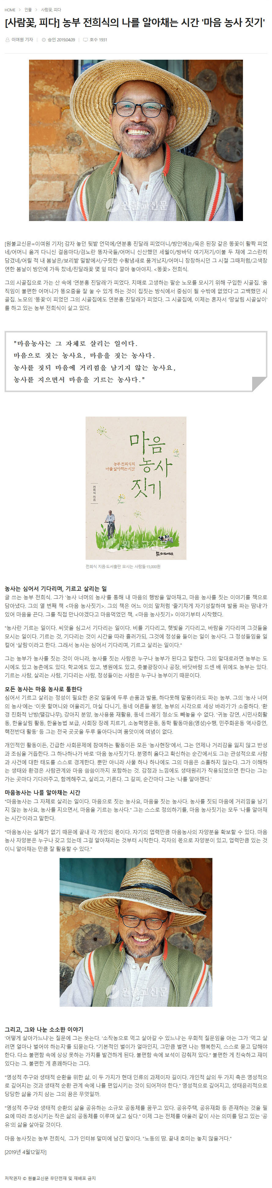 [사람꽃, 피다] 농부 전희식의 나를 알아채는 시간 '마음 농사 짓기'[원불교신문=이여원 기자] 감자 놓던 뒷밭 언덕에/연분홍 진달래 피었더니/방안에는/묵은 된장 같은 똥꽃이 활짝 피었네/어머니 옮겨 다니신 걸음마다/검노란 똥자국들/어머니 신산했던 세월이/방바닥 여기저기/이불 두 채에 고스란히 담겼네/어릴 적 내 봄날은/보리밭 밀밭에서/구릿한 수황냄새로 품겨났지/어머니 창창하시던 그 시절 그때처럼/고색창연한 봄날이 방안에 가득 찼네/진달래꽃 몇 잎 따다 깔아 놓아야지. <똥꽃> 전희식. 그의 시골집으로 가는 산 속에 '연분홍 진달래'가 피었다. 치매로 고생하는 팔순 노모를 모시기 위해 구입한 시골집. '움직임이 불편한 어머니가 똥오줌을 잘 눌 수 있게 하는 것이 집짓는 방식에서 중심이 될 수밖에 없었다'고 고백했던 시골집. 노모의 '똥꽃'이 피었던 그의 시골집에도 연분홍 진달래가 피었다. 그 시골집에, 이제는 혼자서 '땅살림 시골살이'를 하고 있는 농부 전희식이 살고 있다. "마음농사는 그 자체로 살리는 일이다. 농사는 심어서 기다리며, 기르고 살리는 일글 쓰는 농부 전희식. 그가 '농사 너머의 농사'를 통해 내 마음의 행방을 알아채고, 마음 농사를 짓는 이야기를 책으로 담아냈다. 그의 열 번째 책 <마음 농사짓기>. 그의 책은 어느 이의 말처럼 '줄기차게 자기성찰하며 발품 파는 땀내'가 있어 마음을 끈다. 그를 직접 만나야겠다고 마음먹었던 책, <마음 농사짓기> 이야기부터 시작했다. "농사란 기르는 일이다. 씨앗을 심고서 기다리는 일이다. 비를 기다리고, 햇빛을 기다리고, 바람을 기다리며 그것들을 모시는 일이다. 기르는 것, 기다리는 것이 시간을 따라 흘러가되, 그것에 정성을 들이는 일이 농사다. 그 정성들임을 일컬어 '살림'이라고 한다. 그래서 농사는 심어서 기다리며, 기르고 살리는 일이다." 그는 농부가 농사를 짓는 것이 아니라, 농사를 짓는 사람은 누구나 농부가 된다고 말한다. 그의 말대로라면 농부는 도시에도 있고 농촌에도 있다. 학교에도 있고, 병원에도 있고, 촛불광장이나 공장, 바닷바람 드센 배 위에도 농부는 있다. 기르는 사람, 살리는 사람, 기다리는 사람, 정성들이는 사람은 누구나 농부이기 때문이다. 모든 농사는 마음 농사로 통한다심어서 기르고 살리는 정성이 필요한 온갖 일들에 두루 손품과 발품, 하다못해 말품이라도 파는 농부. 그의 '농사 너머의 농사'에는 '이웃 할머니와 어울리기, 마실 다니기, 동네 어른들 봉양, 농부의 시각으로 세상 바라기'가 소중하다. '환경 친화적 난방(땔감나무), 강아지 분양, 농사용품 재활용, 동네 쓰레기 청소'도 빼놓을 수 없다. '귀농 강연, 시민사회활동, 한울살림 활동, 한울농법 보급, 사회장 장례 치르기, 소농혁명운동, 동학 활동마음(영성)수행, 민주화운동 역사증언, 핵전반대 활동' 등 그는 전국 곳곳을 두루 돌아다니며 품앗이에 여념이 없다. 개인적인 활동이든, 긴급한 사회문제에 참여하는 활동이든 모든 '농사현장'에서, 그는 언제나 거리감을 잃지 않고 반성과 조심을 거듭한다. 그 하나하나가 바로 '마음 농사짓기'다. 분명히 옳다고 확신하는 순간에서도 그는 관성적으로 사람과 사건에 대한 태도를 스스로 경계한다. 뿐만 아니라 사물 하나 하나에도 그의 마음은 소홀하지 않는다. 그가 이해하는 생태와 환경은 사람관계와 마음 씀씀이까지 포함하는 것. 감정과 느낌에도 생태원리가 작용되었으면 한다는 그는 가는 곳마다 기다려주고, 함께해주고, 살리고, 기른다. 그 갈피, 순간마다 그는 '나를 알아챈다.' 마음농사는 나를 알아채는 시간"마음농사는 그 자체로 살리는 일이다. 마음으로 짓는 농사요, 마음을 짓는 농사다. 농사를 짓되 마음에 거리낌을 남기지 않는 농사요, 농사를 지으면서, 마음을 기르는 농사다." 그는 스스로 정의하기를, 마음 농사짓기는 모두 '나를 알아채는 시간'이라고 말한다. "마음농사는 실체가 없기 때문에 끝내 각 개인의 몫이다. 자기의 업력만큼 마음농사의 자양분을 확보할 수 있다. 마음농사 자양분은 누구나 갖고 있는데 그걸 알아채리는 것부터 시작한다. 각자의 몫으로 자양분이 있고, 업력만큼 있는 것이니 알아채는 만큼 잘 활용할 수 있다." 그리고, 그와 나눈 소소한 이야기'어떻게 살아가느냐'는 질문에 그는 웃는다. '소작농으로 먹고 살아갈 수 있느냐'는 우회적 질문임을 아는 그가 '먹고 살려면 얼마나 벌어야 하는지'를 되묻는다. "기본적인 벌이가 얼마인지, 그만큼 벌면 나는 행복한지, 스스로 묻고 답해야 한다. 다소 불편함 속에 상상 못하는 가치를 발견하게 된다. 불편함 속에 보석이 감춰져 있다." 불편한 게 친숙하고 재미있다는 그. 불편한 게 흔쾌하다는 그다. "영성적 추구와 생태적 순환을 위한 삶, 이 두 가지가 현대 인류의 과제이자 길이다. 개인적 삶의 두 가지 축은 영성적으로 깊어지는 것과 생태적 순환 관계 속에 나를 편입시키는 것이 되어져야 한다." 영성적으로 깊어지고, 생태윤리적으로 당당한 삶을 가치 삼는 그의 꿈은 무엇일까. "영성적 추구와 생태적 순환의 삶을 공유하는 소규모 공동체를 꿈꾸고 있다. 공유주택, 공유재화 등 존재하는 것을