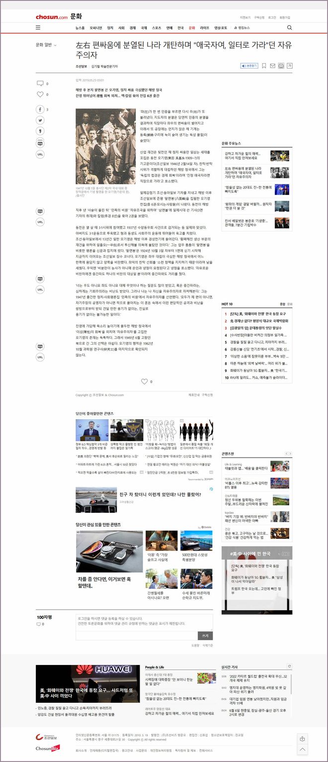 '너는 우도 아니요 좌도 아니요 대체 무엇이냐 하는 질문도 많이 받았고, 혹은 중간파라는, 심하게는 기회주의라는 비난도 받았다. 그러나 나는 나 자신을 자유주의자로 자처해본다.' 그는 1947년 출간한 정치·사회평론집 '민족의 비원'에서 자유주의자를 선언했다. '모두가 제 편이 아니면, 자기주장의 공명자가 아니면 적으로 몰아치는 이 혼돈 속에서 이런 편당적인 공격과 비난을 쌍방으로부 터 받되 견딜 만한 용기가 없이는, 진실로 용기가 없이는 불가능한 일이다.'