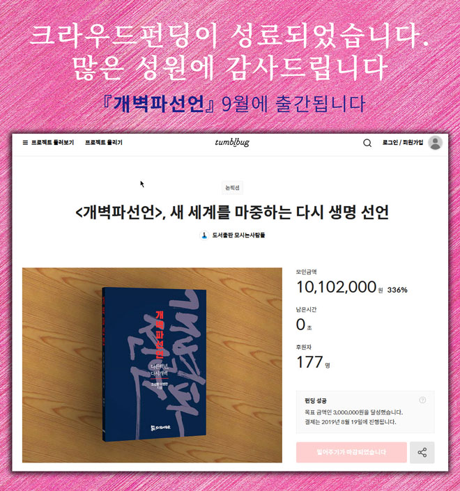| 개벽파선언, 텀블벅에서 크라우드펀딩 진행합니다 (0) | 2019.07.18 |