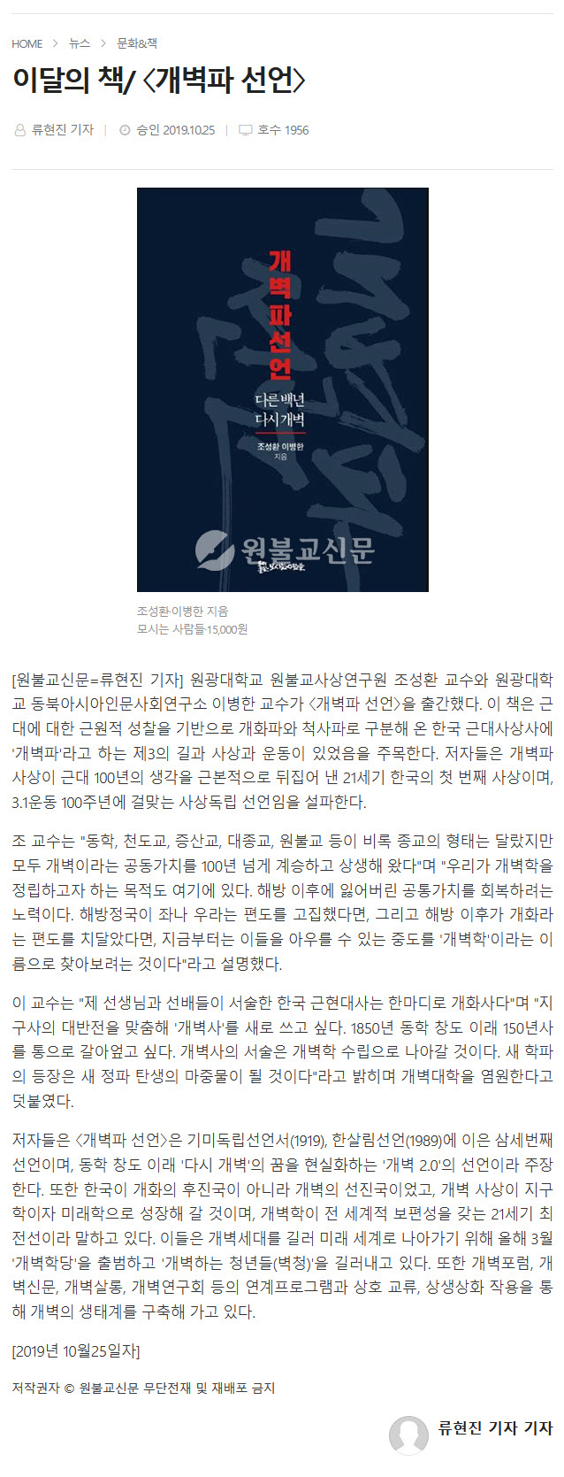 이달의 책/ <개벽파 선언>[원불교신문=류현진 기자] 원광대학교 원불교사상연구원 조성환 교수와 원광대학교 동북아시아인문사회연구소 이병한 교수가 <개벽파 선언>을 출간했다. 이 책은 근대에 대한 근원적 성찰을 기반으로 개화파와 척사파로 구분해 온 한국 근대사상사에 '개벽파'라고 하는 제3의 길과 사상과 운동이 있었음을 주목한다. 저자들은 개벽파 사상이 근대 100년의 생각을 근본적으로 뒤집어 낸 21세기 한국의 첫 번째 사상이며, 3.1운동 100주년에 걸맞는 사상독립 선언임을 설파한다. 조 교수는 "동학, 천도교, 증산교, 대종교, 원불교 등이 비록 종교의 형태는 달랐지만 모두 개벽이라는 공동가치를 100년 넘게 계승하고 상생해 왔다"며 "우리가 개벽학을 정립하고자 하는 목적도 여기에 있다. 해방 이후에 잃어버린 공통가치를 회복하려는 노력이다. 해방정국이 좌나 우라는 편도를 고집했다면, 그리고 해방 이후가 개화라는 편도를 치달았다면, 지금부터는 이들을 아우를 수 있는 중도를 '개벽학'이라는 이름으로 찾아보려는 것이다"라고 설명했다. 이 교수는 "제 선생님과 선배들이 서술한 한국 근현대사는 한마디로 개화사다"며 "지구사의 대반전을 맞춤해 '개벽사'를 새로 쓰고 싶다. 1850년 동학 창도 이래 150년사를 통으로 갈아엎고 싶다. 개벽사의 서술은 개벽학 수립으로 나아갈 것이다. 새 학파의 등장은 새 정파 탄생의 마중물이 될 것이다"라고 밝히며 개벽대학을 염원한다고 덧붙였다. 저자들은 <개벽파 선언>은 기미독립선언서(1919), 한살림선언(1989)에 이은 삼세번째 선언이며, 동학 창도 이래 '다시 개벽'의 꿈을 현실화하는 '개벽 2.0'의 선언이라 주장한다. 또한 한국이 개화의 후진국이 아니라 개벽의 선진국이었고, 개벽 사상이 지구학이자 미래학으로 성장해 갈 것이며, 개벽학이 전 세계적 보편성을 갖는 21세기 최전선이라 말하고 있다. 이들은 개벽세대를 길러 미래 세계로 나아가기 위해 올해 3월 '개벽학당'을 출범하고 '개벽하는 청년들(벽청)'을 길러내고 있다. 또한 개벽포럼, 개벽신문, 개벽살롱, 개벽연구회 등의 연계프로그램과 상호 교류, 상생상화 작용을 통해 개벽의 생태계를 구축해 가고 있다. <출처: 원불교신문(http://www.wonnews.co.kr/news/articleView.html?idxno=204565)> |