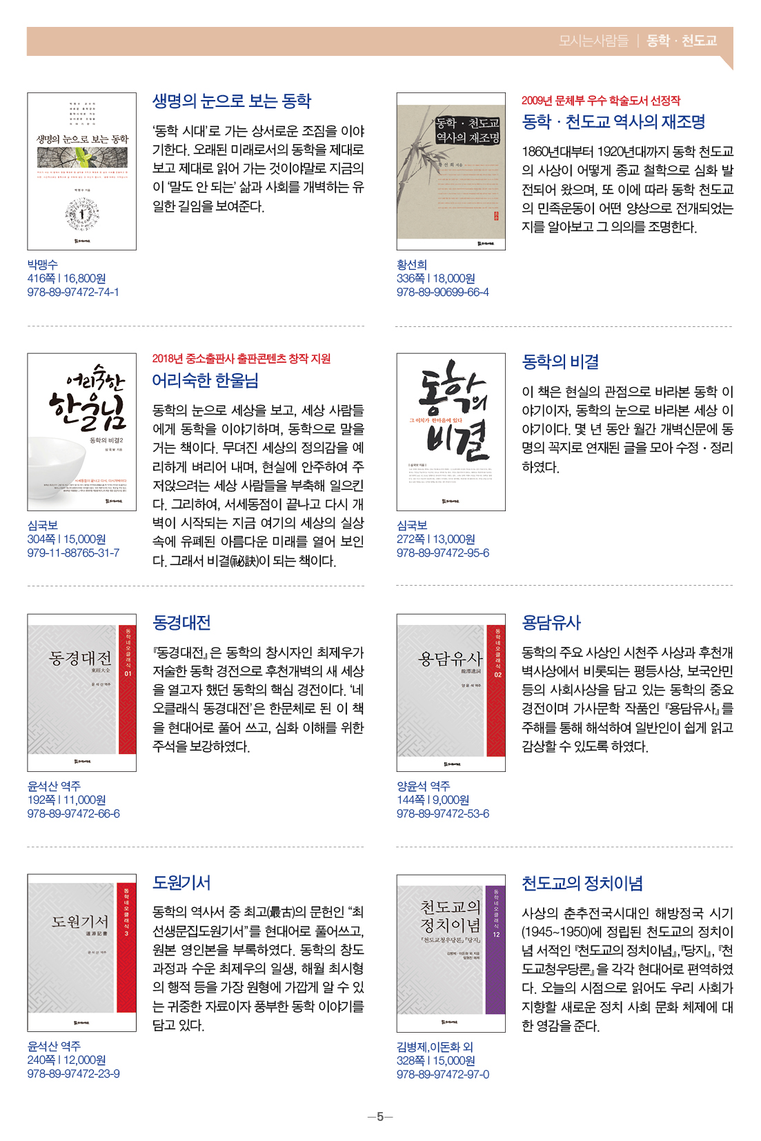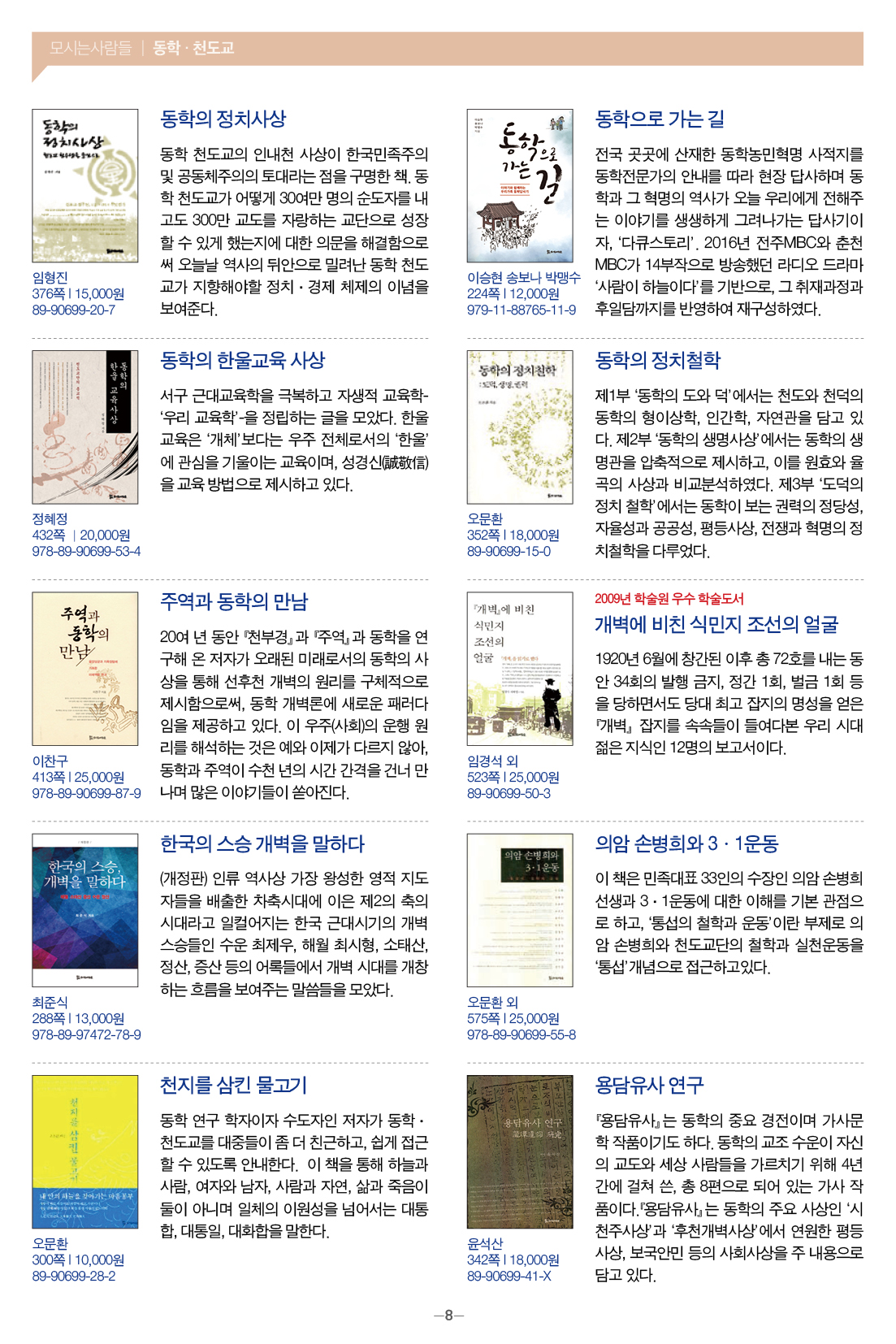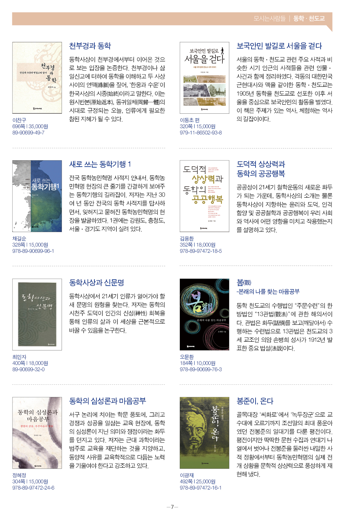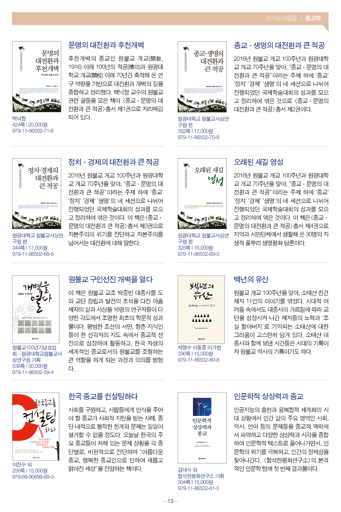 모들통문 11호는 [동학·천도교], [종교학], [인문사회과학], [문학] 네 개 분야와 평화교실, 죽음학 총서 등의 시리즈, 『동학 천도교 인명사전』, 『한국신종교대사전』 등 약 300종의 도서에 대한 정보를 담았습니다.