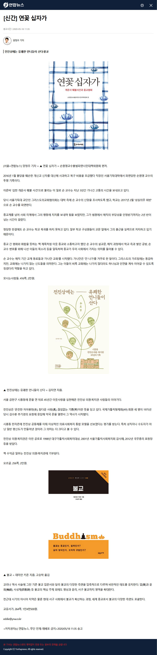 [신간] 연꽃 십자가양정우 기자 ▲ 전진상에는 유쾌한 언니들이 산다·불교(서울=연합뉴스) 양정우 기자 = ▲ 연꽃 십자가 = 손원영교수불법파면시민대책위원회 편저. 2016년 1월 불당을 훼손한 개신교 신자를 대신해 사과하고 복구 비용을 모금했다 직장인 서울기독대학에서 파면당한 손원영 교수의 투쟁 기록이다. 이른바 '김천 개운사 훼불 사건'으로 불리는 이 일로 손 교수는 지난 3년간 기나긴 고통의 시간을 보내오고 있다. 손 교수는 해직 기간 교계 동료들과 '가나안 교회'를 시작했다. 가나안은 '안 나가'를 거꾸로 한 말이다. 그리스도의 가르침에는 동감하지만, 교회에는 나가지 않는 신도들을 의미한다. 그는 이들이 비록 교회에는 나가지 않더라도 하나님과 인연을 계속 이어갈 수 있도록 징검다리 역할을 하고 있다. 모시는사람들. 416쪽. 2만원. <출처: 연합뉴스(https://www.yna.co.kr/view/AKR20200518069300005)> |