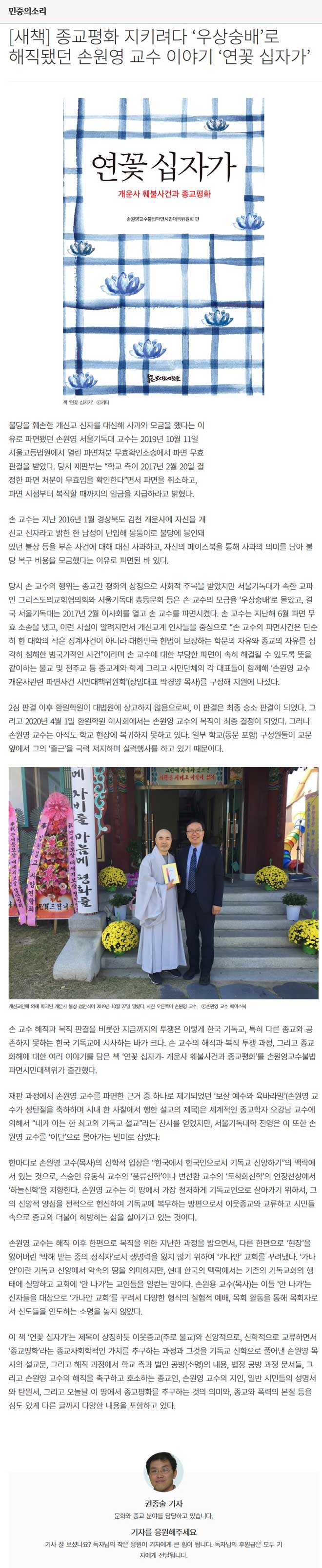 [새책] 종교평화 지키려다 ‘우상숭배’로 해직됐던 손원영 교수 이야기 ‘연꽃 십자가’권종술 기자 불당을 훼손한 개신교 신자를 대신해 사과와 모금을 했다는 이유로 파면됐던 손원영 서울기독대 교수는 2019년 10월 11일 서울고등법원에서 열린 파면처분 무효확인소송에서 파면 무효 판결을 받았다. 당시 재판부는 “학교 측이 2017년 2월 20일 결정한 파면 처분이 무효임을 확인한다”면서 파면을 취소하고, 파면 시점부터 복직할 때까지의 임금을 지급하라고 밝혔다. 손 교수는 지난 2016년 1월 경상북도 김천 개운사에 자신을 개신교 신자라고 밝힌 한 남성이 난입해 몽둥이로 불당에 봉인돼 있던 불상 등을 부순 사건에 대해 대신 사과하고, 자신의 페이스북을 통해 사과의 의미를 담아 불당 복구 비용을 모금했다는 이유로 파면된 바 있다. 당시 손 교수의 행위는 종교간 평화의 상징으로 사회적 주목을 받았지만 서울기독대가 속한 교파인 그리스도의교회협의회와 서울기독대 총동문회 등은 손 교수의 모금을 ‘우상숭배’로 몰았고, 결국 서울기독대는 2017년 2월 이사회를 열고 손 교수를 파면시켰다. 손 교수는 지난해 6월 파면 무효 소송을 냈고, 이런 사실이 알려지면서 개신교계 인사들을 중심으로 “손 교수의 파면사건은 단순히 한 대학의 작은 징계사건이 아니라 대한민국 헌법이 보장하는 학문의 자유와 종교의 자유를 심각히 침해한 범국가적인 사건”이라며 손 교수에 대한 부당한 파면이 속히 해결될 수 있도록 뜻을 같이하는 불교 및 천주교 등 종교계와 학계 그리고 시민단체의 각 대표들이 함께해 ‘손원영 교수 개운사관련 파면사건 시민대책위원회’(상임대표 박경양 목사)를 구성해 지원에 나섰다. 2심 판결 이후 환원학원이 대법원에 상고하지 않음으로써, 이 판결은 최종 승소 판결이 되었다. 그리고 2020년 4월 1일 환원학원 이사회에서는 손원영 교수의 복직이 최종 결정이 되었다. 그러나 손원영 교수는 아직도 학교 현장에 복귀하지 못하고 있다. 일부 학교(동문 포함) 구성원들이 교문 앞에서 그의 ‘출근’을 극력 저지하며 실력행사를 하고 있기 때문이다. 손 교수 해직과 복직 판결을 비롯한 지금까지의 투쟁은 이렇게 한국 기독교, 특히 다른 종교와 공존하지 못하는 한국 기독교에 시사하는 바가 크다. 손 교수의 해직과 복직 투쟁 과정, 그리고 종교 화해에 대한 여러 이야기를 담은 책 ‘연꽃 십자가- 개운사 훼불사건과 종교평화’를 손원영교수불법파면시민대책위가 출간했다. 재판 과정에서 손원영 교수를 파면한 근거 중 하나로 제기되었던 ‘보살 예수와 육바라밀’(손원영 교수가 성탄절을 축하하며 시내 한 사찰에서 행한 설교의 제목)은 세계적인 종교학자 오강남 교수에 의해서 “내가 아는 한 최고의 기독교 설교”라는 찬사를 얻었지만, 서울기독대학 진영은 이 또한 손원영 교수를 ‘이단’으로 몰아가는 빌미로 삼았다. 한마디로 손원영 교수(목사)의 신학적 입장은 “한국에서 한국인으로서 기독교 신앙하기”의 맥락에 서 있는 것으로, 스승인 유동식 교수의 ‘풍류신학’이나 변선환 교수의 ‘토착화신학’의 연장선상에서 ‘하늘신학’을 지향한다. 손원영 교수는 이 땅에서 가장 철저하게 기독교인으로 살아가기 위하셔, 그의 신앙적 양심을 전적으로 헌신하여 기독교에 복무하는 방편으로서 이웃종교와 교류하고 시민들 속으로 종교와 더불어 하방하는 삶을 살아가고 있는 것이다. 손원영 교수는 해직 이후 한편으로 복직을 위한 지난한 과정을 밟으면서, 다른 한편으로 ‘현장’을 잃어버린 ‘박해 받는 중의 성직자’로서 생명력을 잃지 않기 위하여 ‘가나안’ 교회를 꾸려냈다. ‘가나안’이란 기독교 신앙에서 약속의 땅을 의미하지만, 현대 한국의 맥락에서는 기존의 기독교회의 행태에 실망하고 교회에 ‘안 나가’는 교인들을 일컫는 말이다. 손원용 교수(목사)는 이들 ‘안 나가’는 신자들을 대상으로 ‘가나안 교회’를 꾸려서 다양한 형식의 실험적 예배, 목회 활동을 통해 목회자로서 신도들을 인도하는 소명을 놓지 않았다. 이 책 ‘연꽃 십자가’는 제목이 상징하듯 이웃종교(주로 불교)와 신앙적으로, 신학적으로 교류하면서 ‘종교평화’라는 종교사회학적인 가치를 추구하는 과정과 그것을 기독교 신학으로 풀어낸 손원영 목사의 설교문, 그리고 해직 과정에서 학교 측과 벌인 공방(소명)의 내용, 법정 공방 과정 문서들, 그리고 손원영 교수의 해직을 촉구하고 호소하는 종교인, 손원영 교수의 지인, 일반 시민들의 성명서와 탄원서, 그리고 오늘날 이 땅에서 종교평화를 추구하는 것의 의미와, 종교와 폭력의 본질 등을 심도 있게 다른 글까지 다양한 내용을 포함하고 있다. <출처: 민중의소리(https://www.vop.co.kr/A00001490063.html)> |
