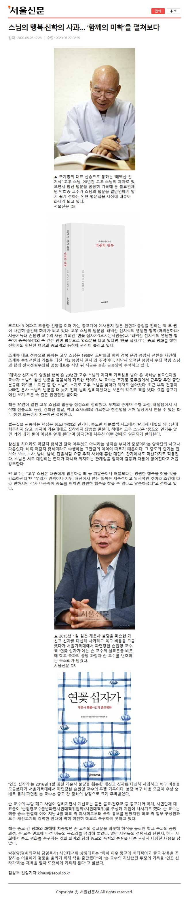 스님의 행복·신학의 사과… ‘함께의 미학’을 펼쳐보다종교가 전한 위로의 두 권김성호 선임기자 코로나19 여파로 조용한 신행을 이어 가는 종교계에 예사롭지 않은 인연과 울림을 전하는 책 두 권이 나란히 출간돼 화제가 되고 있다. 고우 스님의 법문집 ‘태백산 선지식의 영원한 행복’(어의운하)과 서울기독대 손원영 교수의 재판 기록인 `연꽃 십자가´(모시는사람들)다. `태백산 선지식의 영원한 행복´이 승속(僧俗)의 속 깊은 인연 법문으로 입소문을 타고 있다면 `연꽃 십자가´는 종교 평화를 향한 신학자의 험난한 여정과 종교계의 동참에 관심이 쏠리고 있다. … 중간 생략 … ‘연꽃 십자가’는 2016년 1월 김천 개운사 불당을 훼손한 개신교 신자를 대신해 사과하고 복구 비용을 모금했다가 서울기독대에서 파면당한 손원영 교수의 투쟁 기록이다. 불당 복구 비용 모금이 우상 숭배로 몰려 파면된 손 교수는 종교 간 평화의 상징으로 크게 주목받았다. 손 교수의 부당 해고 사실이 알려지면서 개신교는 물론 불교·천주교 등 종교계와 학계, 시민단체 대표들이 ‘손원영교수불법파면시민대책위원회’(시민대책위)를 구성해 지원에 나서기도 했다. 손 교수는 최종 승소 판결에 이어 지난 4월 학교 측 이사회로부터 복직 통보를 받았지만 학교 측 일부 구성원과 보수 개신교계의 강력한 반대에 막혀 여전히 학교로 복귀하지 못하고 있다. 책은 종교 간 평화와 화해에 치중했던 손 교수의 설교문을 비롯해 해직을 둘러싼 학교 측과의 공방 과정, 손 교수 변호에 나선 이들의 목소리를 정리해 놓았다. 일반 시민들의 성명서와 탄원서, 한국 사회에서 종교 평화를 추구하는 것의 의미와 함께 종교와 폭력의 본질을 다룬 글까지 다양한 내용을 담았다. 박경양(평화의교회 담임목사) 시민대책위 상임대표는 “특히 이웃 종교에 배타적이고 종교 갈등을 조장하는 이들에게 경종을 울리기 위해 책을 출판했다”며 “손 교수의 지난했던 투쟁의 기록을 ‘연꽃 십자가´라는 제목을 달아 또렷하게 기록해 둔다”고 밝혔다. <출처: 서울신문(https://www.seoul.co.kr/news/newsView.php?id=20200527022001)> |