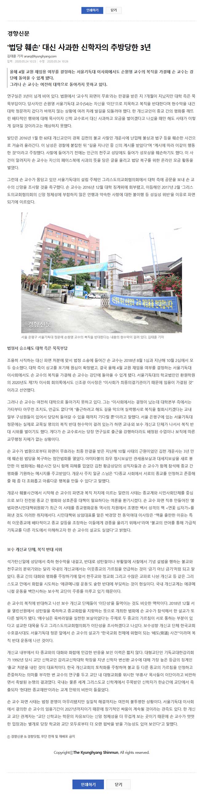 조용히 사직하는 대신 파면 처분에 맞서 법정 소송에 들어간 손 교수는 2018년 8월 1심과 지난해 10월 2심에서 모두 승소했다. 대학 측이 상고를 포기해 원심이 확정됐고, 결국 올해 4월 교원 재임용 여부를 결정하는 서울기독대 이사회에서도 손 교수의 복직을 가결해 손 교수는 강단에 돌아올 수 있게 됐다. 서울기독대의 학교법인인 환원학원의 2020년도 제7차 이사회 회의록에서도 신조광 이사장은 “이사회가 최종의결기관이기 때문에 임용이 가결된 것”이라고 선언했다.