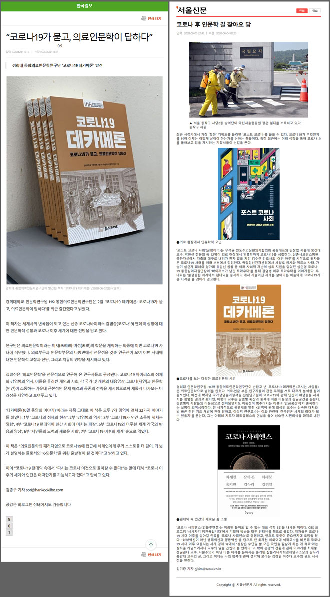 “코로나19가 묻고, 의료인문학이 답하다”김종구 기자 경희대 통합의료인문학연구단 '코로나19 데카메론' 발간경희대학교 인문학연구원 HK+통합의료인문학연구단은 2일 ‘코로나19 데카메론: 코로나19가 묻고, 의료인문학이 답하다’를 최근 출간했다고 밝혔다. 이 책자는 세계사의 변곡점이 되고 있는 신종 코로나바이러스 감염증(코로나19) 팬데믹 상황에 대한 인문학적 성찰과 코로나 이후 세계에 대한 전망을 담고 있다. <출처: 한국일보(https://www.hankookilbo.com/News/Read/202006021553391735)> |