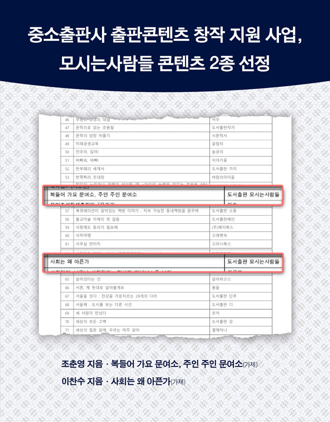 한국출판문화산업진흥원 주관으로 중소출판사의 출간 예정인 콘텐츠를 대상으로 출간을 지원하는 사업인 '2020년 중소출판사 출판콘텐츠 창작 지원 사업'에 도서출판 모시는사람들의 콘텐츠 2종이 선정되었습니다.