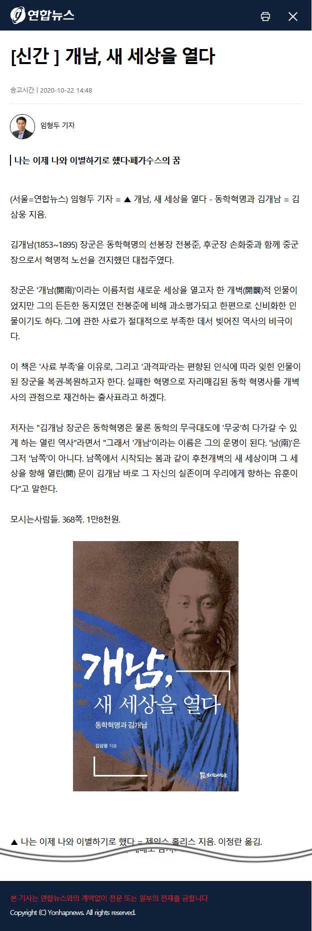 [신간]개남, 새 세상을 열다(서울=연합뉴스) 임형두 기자 = ▲ 개남, 새 세상을 열다 - 동학혁명과 김개남 = 김삼웅 지음. 김개남(1853~1895) 장군은 동학혁명의 선봉장 전봉준, 후군장 손화중과 함께 중군장으로서 혁명적 노선을 견지했던 대접주였다. 모시는사람들. 368쪽. 1만8천원. <출처: 연합뉴스(https://www.yna.co.kr/view/AKR20201022113400005)> |