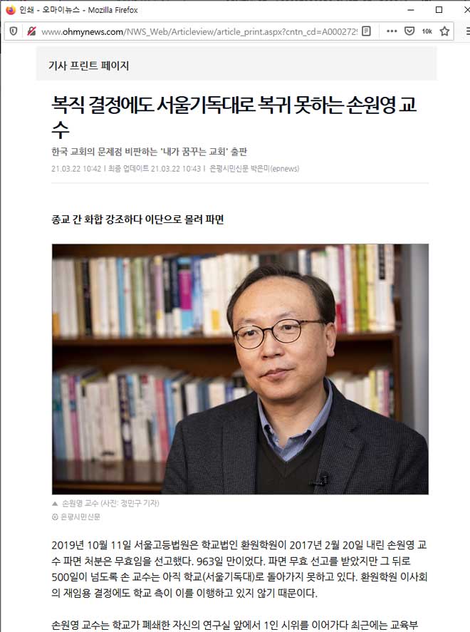 복직 결정에도 서울기독대로 복귀 못하는 손원영 교수한국 교회의 문제점 비판하는 '내가 꿈꾸는 교회' 출판은평시민신문 박은미(epnews) 종교 간 화합 강조하다 이단으로 몰려 파면2019년 10월 11일 서울고등법원은 학교법인 환원학원이 2017년 2월 20일 내린 손원영 교수 파면 처분은 무효임을 선고했다. 963일 만이었다. 파면 무효 선고를 받았지만 그 뒤로 500일이 넘도록 손 교수는 아직 학교(서울기독대)로 돌아가지 못하고 있다. 환원학원 이사회의 재임용 결정에도 학교 측이 이를 이행하고 있지 않기 때문이다. 손원영 교수는 학교가 폐쇄한 자신의 연구실 앞에서 1인 시위를 이어가다 최근에는 교육부 앞 1인 시위를 진행했다. 복직 결정 이후에도 학교로 돌아가지 못하고 있는 서울기독대 손원영 교수를 지난 15일 서울 은평구 녹번동 반짝반짝사진방에서 만났다. - 2020년 3월 이사회에서 복직 결정을 내렸는데 아직까지 학교에 복직하지 못하고 있다. "지난해 4월 1일자로 복직 결정이 났는데 학교 측이 재임용 이행명령을 거부하고 있어 아직까지 학교로 돌아가지 못하고 있다. 저도 확실한 학교상황을 잘 모르지만 듣기로는 이사회가 제대로 역할을 못하고 있어서 총장이 이사회 명령을 거부해도 어떤 조치를 취하지 못하고 있는 거 같다." - 학교 측은 왜 재임용을 반대하는지? "표면적으로는 학교 설립 이념과 제 신학사상이 달라서 받아들일 수 없다는 거예요. 예를 들면 제가 어느 사찰에 가서 예수님 오신 날 축하 법회를 했어요. 한 스님께서 성탄절을 축하하는 설교를 부탁했거든요. 설교를 해달라는 요청에 목사로서 제가 거부할 이유가 없더라고요. 기독교인으로서 아골 골짜기라도 가서 복음을 전해야 하는데 사찰이라고 해서 제가 못 갈 이유는 없었죠. 그런 일들을 이단이라고 몰아세우고 재임용을 방해하고 있는 상황입니다." - 학교로부터 수차례 징계를 받은 걸로 아는데. "2014년도에 첫 징계를 받았어요. 제가 받은 세례가 잘못된 거니까 다시 세례를 받으라는 거예요. 심지어 침례를 안 받으면 구원을 못 받는다 이렇게 얘기해서 이건 신학적으로 너무 말이 안 된다고 얘기했죠. 그 말을 안 들었다고 정직 2개월을 받았죠. - 오히려 종교 간의 화합과 소통을 위해 활동한 것으로 볼 수 있을 거 같은데. "네, 저는 교회에서 사랑을 중요하다고 말하면서도 다른 이들이나 다른 종교를 미워하고 또 미워하도록 부추기는 그런 일은 참 안타깝다고 보고 있어요." - 파면 이후 어려운 시간을 보내고 있는데 만약 다시 그 때로 돌아간다면 그래도 똑같이 종교간의 화합을 위한 활동을 할 수 있을까? "그럼요. 제가 할 수 있는 만큼 해야죠. 우리나라는 그래도 비교적 종교 간의 화해나 평화가 잘 지켜지고 있어요. 종교를 이유로 오랜 기간 전쟁을 치른 외국 사례도 많잖아요? 우리는 유불선에 기독교까지 4대 종교가 공존하면서도 평화를 유지하고 있는데요. 최근 개신교 쪽에서 지나칠 정도로 타 종교를 공격하는 일이 많이 생기고 있어서 안타까운 마음입니다." - 기독대학교에서 학생들에게 강조한 얘기는 무엇인지 궁금하다. "1999년 3월에 기독대 교수로 임용이 됐어요. 벌써 20년이 넘었네요. 저는 기독대학교가 작은 학교이지만 좋은 교수님들이 많고 학생들도 참 순수한 면이 좋았어요. '성서로 돌아가자'는 게 학교 교훈입니다. 한국 교회가 분열이 심하고 부패도 심각한 상황에서 초심으로 돌아가자는 말이 저는 참 좋더라고요. 제 전공이 기독교 교육인데요, 결국 성서적으로 아는 것과 살아가는 일이 일치하도록 돕는 활동을 하는 겁니다. 그래서 저도 백프로 그렇게 살지는 못하지만 학생들에게 배운 대로 살자, 예수님 말씀 공감하면서 살자 그런 얘기를 많이 했습니다." - 최근에 '내가 꿈꾸는 교회'라는 책을 냈는데. "2017년에 해직되고 나서 뭘 할까 고민을 많이 했어요. 2017년은 루터 종교개혁 500주년이 되는 때였죠. 루터가 당시 부패한 가톨릭교회에 저항하면서 속죄의 효력에 관한 '95개의 조문'을 발표했는데 이게 종교 개혁의 시작이 되었어요. 루터에 관해 공부를 하면서 지금의 한국 교회가 루터 시대의 종교보다 더 부패하고 문제가 많은 것 아닌가 생각이 들어 부끄럽더라고요. 500년 전의 루터 종교개혁을 기억하는 것도 중요하지만 지금 우리 종교는 어떤지 돌아보고 어떤 방향으로 가면 좋은지 꿈꿔보자는 생각이 들었어요. - '내가 꿈꾸는 교회'에서 강조하는 얘기는 무엇인지? "우선은 개혁을 끊임없이 해야 한다는 겁니다. 개혁이라는 말도 오염이 된 듯하고 혁명이라는 말은 정치적 용어이니 개벽이라는 말로 표현하면 좋겠어요. 아주 근본적인 변화를 해야 하는 시간이다, 개혁 수준으로는 변화를 이뤄내기 어렵고 종교 문명이 완전 환골탈퇴 할 정도의 근본적인 변화가 필요하다고 봅니다. - 시민들에게 전하고 싶은 얘기가 있다면? "지금 한국의 기독교나 불교가 잘하는 점도 있고 아쉬운 점도 많은데요, 종교의 문제를 종교인들만의 문제로 바라보지 말고 잘 못할 때는 채찍질도 하고 잘 할 때는 칭찬도 하면서 우리 사회가 더 공의로운 사회, 민주사회로 갈 수 있도록 함께 만들어 가면 좋겠습니다." <