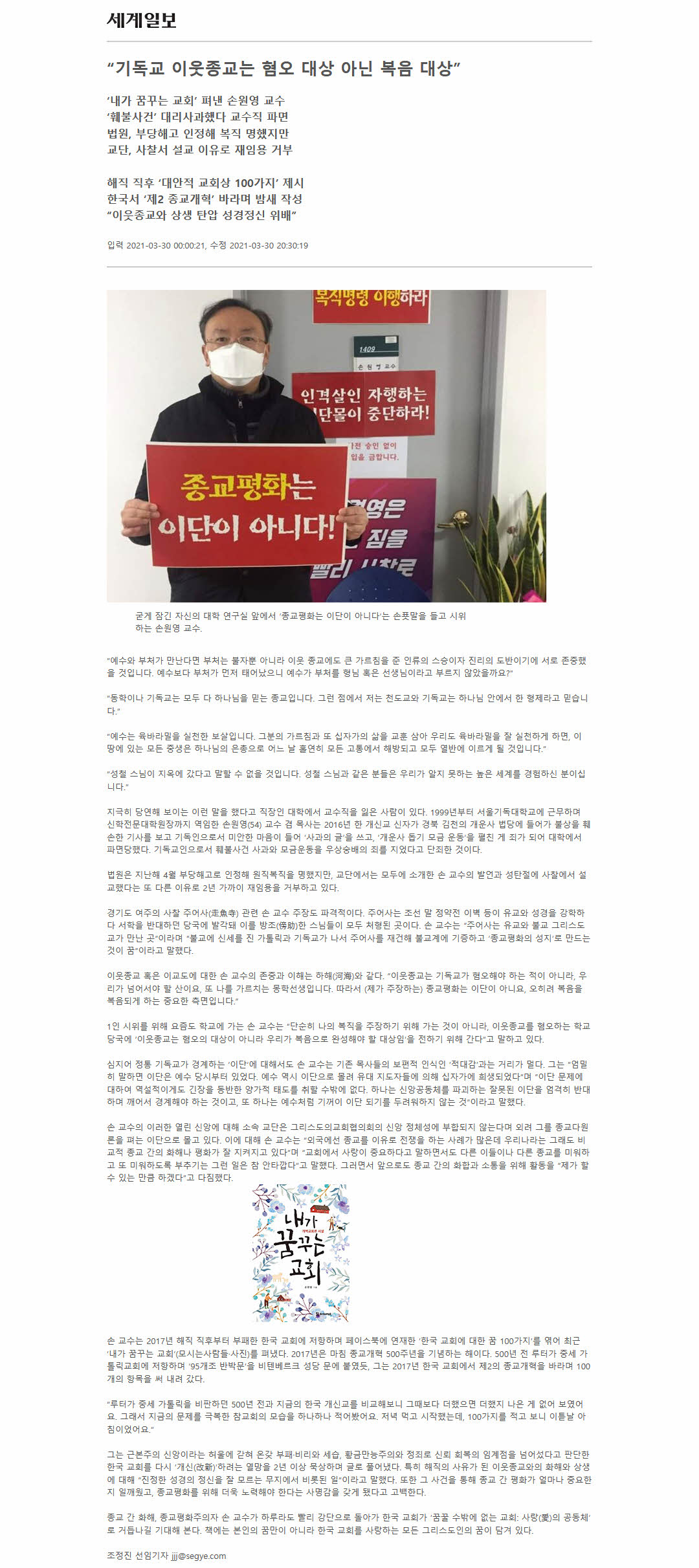 손 교수는 2017년 해직 직후부터 부패한 한국 교회에 저항하며 페이스북에 연재한 ‘한국 교회에 대한 꿈 100가지’를 엮어 최근 ‘내가 꿈꾸는 교회’(모시는사람들·사진)를 펴냈다. 2017년은 마침 종교개혁 500주년을 기념하는 해이다. 500년 전 루터가 중세 가톨릭교회에 저항하며 ‘95개조 반박문’을 비텐베르크 성당 문에 붙였듯, 그는 2017년 한국 교회에서 제2의 종교개혁을 바라며 100개의 항목을 써 내려 갔다.