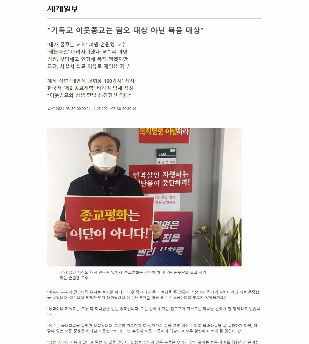 1인 시위를 위해 요즘도 학교에 가는 손 교수는 “단순히 나의 복직을 주장하기 위해 가는 것이 아니라, 이웃종교를 혐오하는 학교 당국에 ‘이웃종교는 혐오의 대상이 아니라 우리가 복음으로 완성해야 할 대상임’을 전하기 위해 간다”고 말하고 있다.