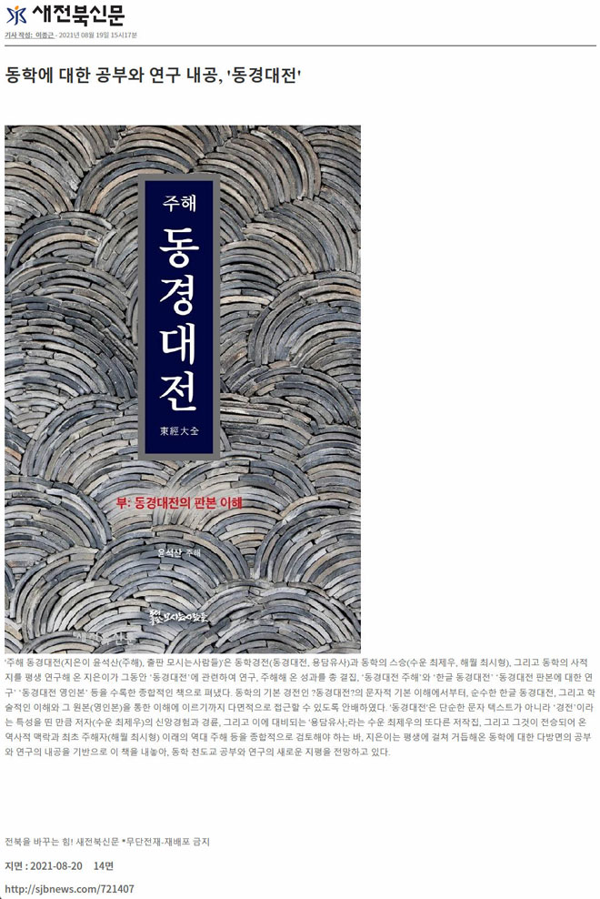 동학에 대한 공부와 연구 내공, '동경대전'이종근 '주해 동경대전(지은이 윤석산(주해), 출판 모시는사람들)'은 동학경전(동경대전, 용담유사)과 동학의 스승(수운 최제우, 해월 최시형), 그리고 동학의 사적지를 평생 연구해 온 지은이가 그동안 ‘동경대전’에 관련하여 연구, 주해해 온 성과를 총 결집, ‘동경대전 주해’와 ‘한글 동경대전’ ‘동경대전 판본에 대한 연구’ ‘동경대전 영인본’ 등을 수록한 종합적인 책으로 펴냈다. 동학의 기본 경전인 ?동경대전?의 문자적 기본 이해에서부터, 순수한 한글 동경대전, 그리고 학술적인 이해와 그 원본(영인본)을 통한 이해에 이르기까지 다면적으로 접근할 수 있도록 안배하였다. '동경대전'은 단순한 문자 텍스트가 아니라 ‘경전’이라는 특성을 띤 만큼 저자(수운 최제우)의 신앙경험과 경륜, 그리고 이에 대비되는 '용담유사;라는 수운 최제우의 또다른 저작집, 그리고 그것이 전승되어 온 역사적 맥락과 최초 주해자(해월 최시형) 이래의 역대 주해 등을 종합적으로 검토해야 하는 바, 지은이는 평생에 걸쳐 거듭해온 동학에 대한 다방면의 공부와 연구의 내공을 기반으로 이 책을 내놓아, 동학 천도교 공부와 연구의 새로운 지평을 전망하고 있다. <출처: 새전북신문(http://sjbnews.com/news/news.php?number=721407)> |