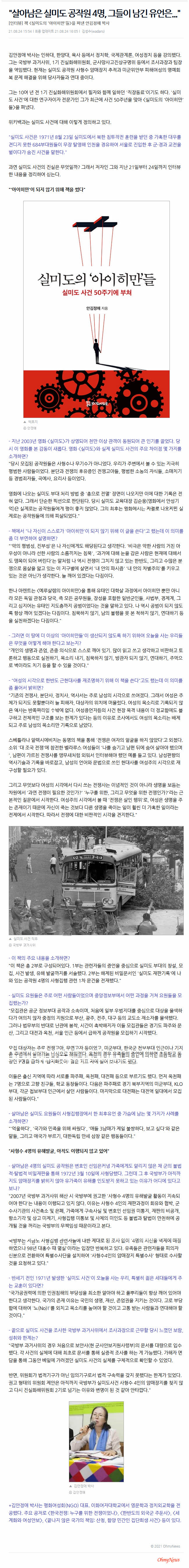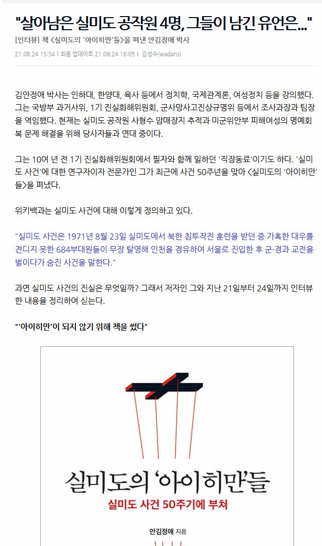 "살아남은 실미도 공작원 4명, 그들이 남긴 유언은…"[인터뷰] 책 <실미도의 '아이히만'들>을 펴낸 안김정애 박사김성수 김안정애 박사는 인하대, 한양대, 육사 등에서 정치학, 국제관계론, 여성정치 등을 강의했다. 그는 국방부 과거사위, 1기 진실화해위원회, 군사망사고진상규명위 등에서 조사과장과 팀장을 역임했다. 현재는 실미도 공작원 사형수 암매장지 추적과 미군위안부 피해여성의 명예회복 문제 해결을 위해 당사자들과 연대 중이다. 그는 10여 년 전 1기 진실화해위원회에서 필자와 함께 일하던 '직장동료'이기도 하다. '실미도 사건'에 대한 연구자이자 전문가인 그가 최근에 사건 50주년을 맞아 <실미도의 '아이히만'들>을 펴냈다. 위키백과는 실미도 사건에 대해 이렇게 정의하고 있다. "실미도 사건은 1971년 8월 23일 실미도에서 북한 침투작전 훈련을 받던 중 가혹한 대우를 견디지 못한 684부대원들이 무장 탈영해 인천을 경유하여 서울로 진입한 후 군·경과 교전을 벌이다가 숨진 사건을 말한다." 과연 실미도 사건의 진실은 무엇일까? 그래서 저자인 그와 지난 21일부터 24일까지 인터뷰한 내용을 정리하여 싣는다. "'아이히만'이 되지 않기 위해 책을 썼다"- 지난 2003년 영화 <실미도>가 상영되어 천만 이상 관객이 동원되어 큰 인기를 끌었다. 당시 이 영화를 본 감동이 새롭다. 영화 <실미도>와 실제 실미도 사건의 주요 차이점 몇 가지를 소개하면? "당시 모집된 공작원들은 사형수나 무기수가 아니었다. 우리가 주변에서 볼 수 있는 지극히 평범한 사람들이었다. 분단과 전쟁의 후유증인 전쟁고아들, 평범한 소농의 자식들, 소매치기 등 경범죄자들, 곡예사, 요리사 등이었다. - 책에서 "나 자신이 스스로가 '아이히만'이 되지 않기 위해 이 글을 쓴다"고 했는데 이 의미를 좀 더 부연하여 설명하면? "'악의 평범성, 진부성'은 나 자신에게도 해당된다고 생각한다. '비극은 악한 사람의 거친 아우성이 아니라 선한 사람의 소름끼치는 침묵', '과거에 대해 눈을 감은 사람은 현재에 대해서도 맹목이 되어 버린다'는 말처럼 나 역시 전쟁이 그치지 않고 있는 한반도, 그리고 수많은 분쟁으로 몸살을 앓고 있는 이 지구별에 살면서 '내 안의 파시즘' '내 안의 차별주의'를 키우고 있는 것은 아닌가 생각한다. 늘 깨어 있겠다는 다짐이다. - 그러면 이 땅에 더 이상의 '아이히만들'이 생산되지 않도록 하기 위하여 오늘을 사는 우리들은 무엇을 어떻게 해야 한다고 보는지? "개인의 생명과 존엄, 존중 의식으로 스스로 깨어 있기. 많이 읽고 쓰고 생각하고 비판하고 토론하고 행동으로 실천하기, 목소리 내기, 침묵하지 않기, 방관자 되지 않기, 연대하기, 주먹으로 벽이라도 치기 등을 할 수 있을 것이다." - "여성의 시각으로 한반도 근현대사를 재조명하기 위해 이 책을 쓴다"고도 했는데 이 의미를 좀 풀어서 밝히면? "기존의 전쟁사, 분단사, 정치사, 역사서는 주로 남성의 시각으로 쓰여졌다. 그래서 여성은 주체가 되지도 못할뿐더러 늘 피해자, 대상자의 위치에 머물렀다. 여성의 목소리로 기록되지 않은 역사는 반쪽짜리일 수밖에 없다. 여성증언자들의 사건 현장 목격 내용이 더 정교함에도 불구하고 전체적인 구조를 보는 한계가 있다는 등의 이유로 조사에서도 여성의 목소리는 배제되고 주로 남성의 목소리만 기록으로 남았다. - 이 책의 주요 내용을 소개하면? "이 책은 총 2부로 구성되어있다. 1부는 관련자들의 증언을 중심으로 실미도 부대의 창설, 모집, 사건 발생, 유해 발굴까지를 서술했다. 2부는 해제된 비밀문서인 '실미도 재판기록'에 나와 있는 공작원 4명의 사형집행 관련 1차 문건을 전재했다." - 실미도 요원들은 주로 어떤 사람들이었으며 중앙정보부에서 어떤 과정을 거쳐 요원들을 모집했는가? "모집관은 공군 정보부대 공작과 소속이며, 처음에 일부 우범지대를 중심으로 대상을 물색하다가 여의치 않자 중정의 지원으로 부산, 광주, 전주, 대구 등의 교도소 재소자를 물색했다. 그러나 법무부의 반대로 난관에 봉착, 시간이 촉박해지자 이들 모집관들은 경기도 파주와 문산, 그리고 대전과 옥천, 서울 인근 등에서 급하게 공작원을 모집하기 시작했다. - 살아남은 실미도 요원들이 사형집행장에서 한 최후유언 중 가슴에 남는 몇 가지가 사례를 소개하면? "'억울하다', '국가와 민족을 위해 싸웠다', '애들 3남매가 제일 불쌍하다, 보고 싶다'와 같은 말들, 그리고 애국가 부르기, 대한독립 만세 삼창 같은 행동들이다." "사형수 4명의 유해발굴, 아직도 이행되지 않고 있어"- 살아남은 4명의 실미도 공작원은 변호인 선임은커녕 가족에게도 알리지 않은 채 군의 불법적·탈법적 비밀재판을 통해 1972년 3월 10일에 사형당했다. 그런데 그 후 국방부가 아직까지도 암매장지를 밝히지 않아 유가족이 유해를 인도받지 못하고 있는 이유가 어디에 있다고 보나? "2007년 국방부 과거사위 해산 시 국방부에 권고한 '사형수 4명의 유해발굴 활동이 지속되어야 한다'는 내용이 이행되고 있지 않다. 이유는 사형수 4인의 재판과정이 회유와 협박, 군수사기관의 사건축소 및 은폐, 가족에게 구속사실 및 변호인 선임권 미통지, 재판