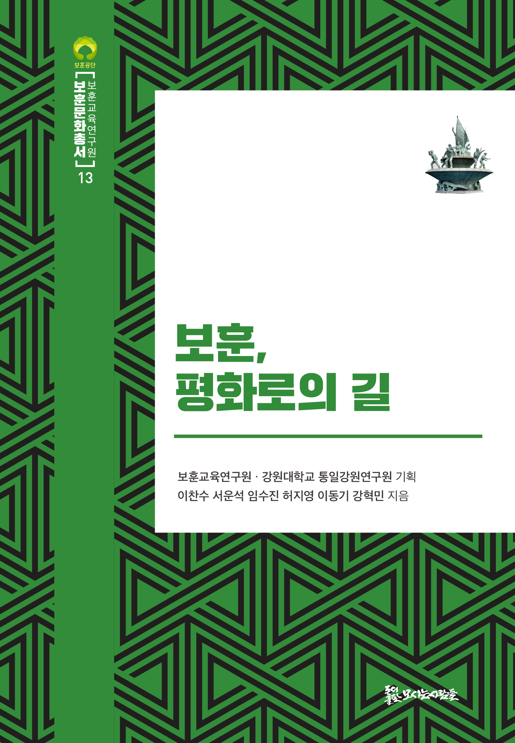이 책은 보훈교육연구원과 강원대학교 통일강원연구원이 ‘보훈’과 ‘평화’를 주제로 하여 공동으로 기획ㆍ편찬한 단행본이다. 이 책은 우리 사회 내 ‘보훈’과 ‘평화’를 주제로 살펴볼 수 있는 다양한 사례를 소개하며, ‘보훈’과 ‘평화’ 관련 역사, 이념, 의미 등을 정리ㆍ소개한다.