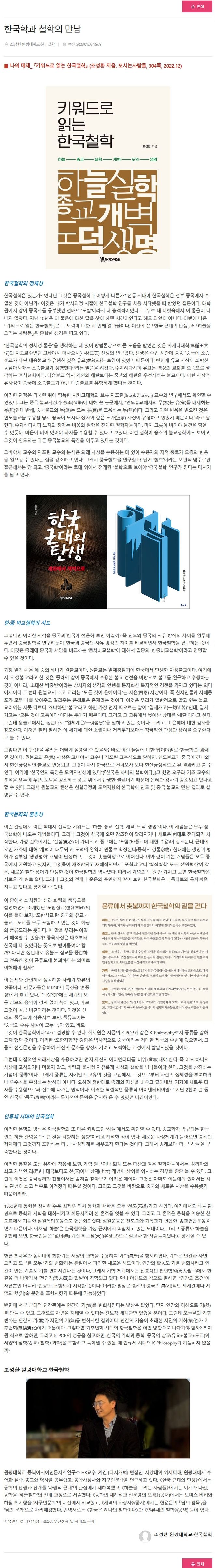 한국학과 철학의 만남■ 나의 테제_ 『키워드로 읽는 한국철학』 (조성환 지음, 모시는사람들, 304쪽, 2022.12)조성환 원광대학교·한국철학 한국철학의 정체성한국철학은 있는가? 있다면 그것은 중국철학과 어떻게 다른가? 전통 시대에 한국철학은 전부 중국에서 수입한 것이 아닌가? 이것은 내가 박사과정 시절에 한국철학 연구를 처음 시작했을 때 받았던 질문이다. 대학원에서 같이 중국사를 공부했던 선배의 ‘도발’이라서 더 충격적이었다. 그 뒤로 내 머릿속에서 이 물음이 떠나지 않았다. 지난 10년은 이 물음에 대한 답을 찾아 헤맨 시간이었다고 해도 과언이 아니다. 이번에 나온 『키워드로 읽는 한국철학』은 그 노력에 대한 세 번째 결과물이다. 이전에 쓴 『한국 근대의 탄생』과 『하늘을 그리는 사람들』을 종합한 성격을 띠고 있다. “한국철학의 정체성 물음”을 생각하는 데 있어 방법론상으로 큰 도움을 받았던 것은 와세다대학(早稲田大学)의 지도교수였던 고바야시 마사요시(小林正美) 선생의 연구였다. 선생은 수업 시간에 종종 “중국에 소승불교가 아닌 대승불교가 유행한 것은 유교(儒敎)라는 토양이 있었기 때문이다. 반면에 유교 사상이 희박한 동남아시아는 소승불교가 성행했다.”라는 말씀을 하셨다. 주지하다시피 유교는 백성의 교화를 으뜸으로 생각하는 정치철학이다. 대승불교 역시 개인의 해탈보다는 중생의 해탈을 우선시하는 불교이다. 이런 사상적 유사성이 중국에 소승불교가 아닌 대승불교를 유행하게 했다는 것이다. 이러한 관점은 귀국한 뒤에 탐독한 시카고대학의 브룩 지포린(Brook Ziporyn) 교수의 연구에서도 확인할 수 있었다. 그는 중국 불교사상가 승조(僧肇)에 대해 쓴 논문에서, “인도불교에서의 무(無)는 유(有)를 배제하는 무(無)인데 반해, 중국불교의 무(無)는 모든 유(有)를 포용하는 무(無)이다. 그리고 이런 변용을 일으킨 것은 인도불교를 수용할 당시 중국에 노자나 장자와 같은 도가(道家) 사상이 유행하고 있었기 때문이다.”라고 말했다. 주지하다시피 노자와 장자는 비움의 철학을 전개한 철학자들이다. 마치 그릇이 비어야 물건을 담을 수 있듯이, 마음이 비어 있어야 타자를 수용할 수 있다고 보았다. 이런 철학이 승조의 불교철학에도 보이고, 그것이 인도와는 다른 중국불교의 특징을 이루고 있다는 것이다. 고바야시 교수와 지포린 교수의 분석은 외래 사상을 수용하는 데 있어 수용자의 지적 풍토가 모종의 변용을 일으킬 수 있다는 점을 강조하고 있다. 그래서 중국철학을 연구할 때 단지 ‘철학’이라는 보편적 범주로만 접근해서는 안 되고, ‘중국학’이라는 토대 위에서 전개된 ‘철학’으로 보아야 ‘중국철학’ 연구가 된다는 메시지를 담고 있다. 한·중 비교철학의 시도그렇다면 이러한 시각을 중국과 한국에 적용해 보면 어떨까? 즉 인도와 중국의 사유 방식의 차이를 염두에 두면서 중국철학을 연구하듯이, 한국과 중국의 사유 방식의 차이를 비교하면서 한국철학을 연구하는 것이다. 이것은 종래에 중국과 서양을 비교하는 ‘동서비교철학’에 대해서 일종의 ‘한중비교철학’이라고 명명할 수 있을 것이다. 가장 알기 쉬운 예 중의 하나가 원불교이다. 원불교는 일제강점기에 한국에서 탄생한 자생불교이다. 여기에서 ‘자생불교’라고 한 것은, 종래와 같이 중국에서 수용한 불교 경전을 바탕으로 불교를 연구하고 수행하는 것이 아니라, ‘소태산 박중빈’이라는 창시자의 생각과 언행을 문자화한 독자적인 경전을 가지고 있다는 의미에서이다. 그런데 원불교의 최고 교리는 “모든 것이 은혜이다”는 사은(四恩) 사상이다. 즉 천지만물과 사해동포가 모두 나를 낳아주고 길러주는 은혜로운 존재라는 것이다. 이것은 우리가 일반적으로 알고 있는 불교 교리와는 사뭇 다르다. 왜냐하면 ‘불교’라고 하면 가장 먼저 떠오르는 말이 “일체개고(一切皆苦)”인데, 일체개고는 “모든 것이 고통이다”이라는 뜻이기 때문이다. 그리고 그 고통에서 벗어난 상태를 ‘해탈’이라고 한다. 그런데 원불교에서는 정반대로 “일체개은(一切皆恩)”을 말하고 있는 것이다. 그리고 그 은혜에 대한 감사를 강조한다. 이것은 달리 말하면 이 세계에 대한 초월이나 거리두기보다는 적극적인 관심과 참여를 요구한다고 볼 수 있다. 그렇다면 이 ‘반전’을 우리는 어떻게 설명할 수 있을까? 바로 이런 물음에 대한 답이야말로 ‘한국학’의 과제일 것이다. 원불교의 은(恩) 사상은 고바야시 교수나 지포린 교수식으로 말하면, 인도불교가 중국에 건너와서 현실긍정적인 불교로 변용되고, 그것이 다시 한국으로 건너오자 보다 현실긍정적으로 된 결과라고 볼 수 있다. 여기에 “한국인의 특징은 도덕지향성에 있다”(『한국은 하나의 철학이다』)고 했던 오구라 기조 교수의 분석을 염두에 두면, 도덕을 강조하는 풍토 위에서 탄생한 불교이기 때문에 은혜와 감사가 강조되고 있다고 할 수 있다. 그래서 원불교의 탄생은 현실긍정과 도덕지향의 한국학이 인도 및 중국 불교와 만난 결과로 설명될 수 있다. 한국문화의 혼종성이런 관점에서 이번 책에서 선택한 키