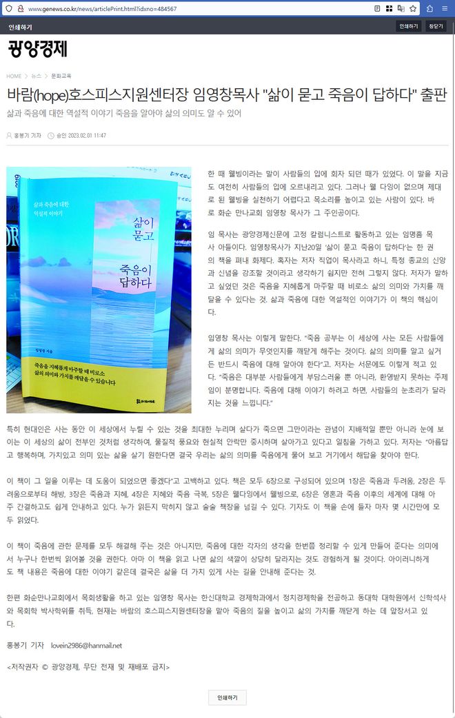 바람(hope)호스피스지원센터장 임영창목사 "삶이 묻고 죽음이 답하다" 출판