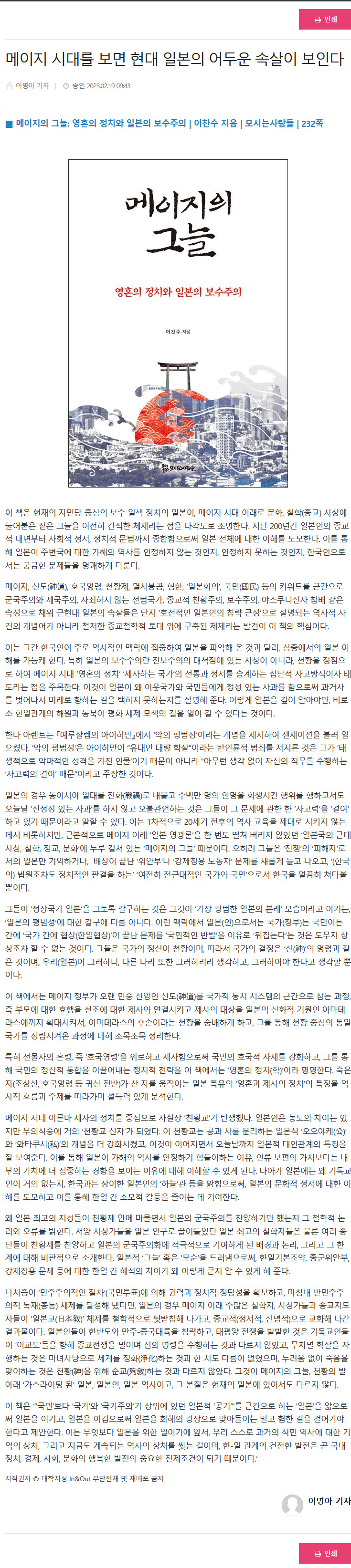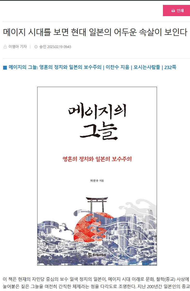 메이지 시대를 보면 현대 일본의 어두운 속살이 보인다■ 메이지의 그늘: 영혼의 정치와 일본의 보수주의 | 이찬수 지음 | 모시는사람들 | 232쪽이명아 기자이 책은 현재의 자민당 중심의 보수 일색 정치의 일본이, 메이지 시대 이래로 문화, 철학(종교) 사상에 눌어붙은 짙은 그늘을 여전히 간직한 체제라는 점을 다각도로 조명한다. 지난 200년간 일본인의 종교적 내면부터 사회적 정서, 정치적 문법까지 종합함으로써 일본 전체에 대한 이해를 도모한다. 이를 통해 일본이 주변국에 대한 가해의 역사를 인정하지 않는 것인지, 인정하지 못하는 것인지, 한국인으로서는 궁금한 문제들을 명쾌하게 다룬다. 메이지, 신도(神道), 호국영령, 천황제, 멸사봉공, 혐한, ‘일본회의’, 국민(國民) 등의 키워드를 근간으로 군국주의와 제국주의, 사죄하지 않는 전범국가, 종교적 천황주의, 보수주의, 야스쿠니신사 참배 같은 속성으로 채워 근현대 일본의 속살들은 단지 ‘호전적인 일본인의 침략 근성’으로 설명되는 역사적 사건의 개념어가 아니라 철저한 종교철학적 토대 위에 구축된 체제라는 발견이 이 책의 핵심이다. 이는 그간 한국인이 주로 역사적인 맥락에 집중하여 일본을 파악해 온 것과 달리, 심층에서의 일본 이해를 가능케 한다. 특히 일본의 보수주의란 진보주의의 대척점에 있는 사상이 아니라, 천황을 정점으로 하여 메이지 시대 ‘영혼의 정치’ ‘제사하는 국가’의 전통과 정서를 승계하는 집단적 사고방식이자 태도라는 점을 주목한다. 이것이 일본이 왜 이웃국가와 국민들에게 정성 있는 사과를 함으로써 과거사를 벗어나서 미래로 향하는 길을 택하지 못하는지를 설명해 준다. 이렇게 일본을 깊이 알아야만, 비로소 한일관계의 해원과 동북아 평화 체제 모색의 길을 열어 갈 수 있다는 것이다. 한나 아렌트는 『예루살렘의 아이히만』에서 ‘악의 평범성’이라는 개념을 제시하여 센세이션을 불러 일으켰다. ‘악의 평범성’은 아이히만이 “유대인 대량 학살”이라는 반인륜적 범죄를 저지른 것은 그가 ‘태생적으로 악마적인 성격을 가진 인물’이기 때문이 아니라 “아무런 생각 없이 자신의 직무를 수행하는 ‘사고력의 결여’ 때문”이라고 주장한 것이다. 일본의 경우 동아시아 일대를 전화(戰禍)로 내몰고 수백만 명의 인명을 희생시킨 행위를 행하고서도 오늘날 ‘진정성 있는 사과’를 하지 않고 오불관언하는 것은 그들이 그 문제에 관한 한 ‘사고력’을 ‘결여’하고 있기 때문이라고 말할 수 있다. 이는 1차적으로 20세기 전후의 역사 교육을 제대로 시키지 않는 데서 비롯하지만, 근본적으로 메이지 이래 ‘일본 영광론’을 한 번도 떨쳐 버리지 않았던 ‘일본국의 근대 사상, 철학, 정교, 문화’에 두루 걸쳐 있는 ‘메이지의 그늘’ 때문이다. 오히려 그들은 ‘전쟁’의 ‘피해자’로서의 일본만 기억하거나, 배상이 끝난 ‘위안부’나 ‘강제징용 노동자’ 문제를 새롭게 들고 나오고, ‘(한국의) 법원조차도 정치적인 판결을 하는’ ‘여전히 전근대적인 국가와 국민’으로서 한국을 멀끔히 쳐다볼 뿐이다. 그들이 ‘정상국가 일본’을 그토록 갈구하는 것은 그것이 ‘가장 평범한 일본의 본래’ 모습이라고 여기는, ‘일본의 평범성’에 대한 갈구에 다름 아니다. 이런 맥락에서 일본(인)으로서는 국가(정부)든 국민이든 간에 ‘국가 간에 협상(한일협상)’이 끝난 문제를 ‘국민적인 반발’을 이유로 ‘뒤집는다’는 것은 도무지 상상조차 할 수 없는 것이다. 그들은 국가의 정신이 천황이며, 따라서 국가의 결정은 ‘신(神)’의 명령과 같은 것이며, 우리(일본)이 그러하니, 다른 나라 또한 그러하리라 생각하고, 그러하여야 한다고 생각할 뿐이다. 이 책에서는 메이지 정부가 오랜 민중 신앙인 신도(神道)를 국가적 통치 시스템의 근간으로 삼는 과정, 즉 부모에 대한 효행을 선조에 대한 제사와 연결시키고 제사의 대상을 일본의 신화적 기원인 아마테라스에까지 확대시켜서, 아마테라스의 후손이라는 천황을 숭배하게 하고, 그를 통해 천황 중심의 통일 국가를 성립시켜온 과정에 대해 조목조목 정리한다. 특히 전몰자의 혼령, 즉 ‘호국영령’을 위로하고 제사함으로써 국민의 호국적 자세를 강화하고, 그를 통해 국민의 정신적 통합을 이끌어내는 정치적 전략을 이 책에서는 ‘영혼의 정치(학)’이라 명명한다. 죽은 자(조상신, 호국영령 등 귀신 전반)가 산 자를 움직이는 일본 특유의 ‘영혼과 제사의 정치’의 특징을 역사적 흐름과 주제를 따라가며 설득력 있게 분석한다. 메이지 시대 이른바 제사의 정치를 중심으로 사실상 ‘천황교’가 탄생했다. 일본인은 농도의 차이는 있지만 무의식중에 거의 ‘천황교 신자’가 되었다. 이 천황교는 공과 사를 분리하는 일본식 ‘오오야케(公)’와 ‘와타쿠시(私)’의 개념을 더 강화시켰고, 이것이 이어지면서 오늘날까지 일본적 대인관계의 특징을 잘 보여준다. 이를 통해 일본이 가해의 역사를 인정하기 힘들어하는 이유, 인류 보편의 가치보다는 내부의 가치에 더 집중하는 경향을 보이는 이유에 대해 이해할 수 있게 된다. 나아가 일본에